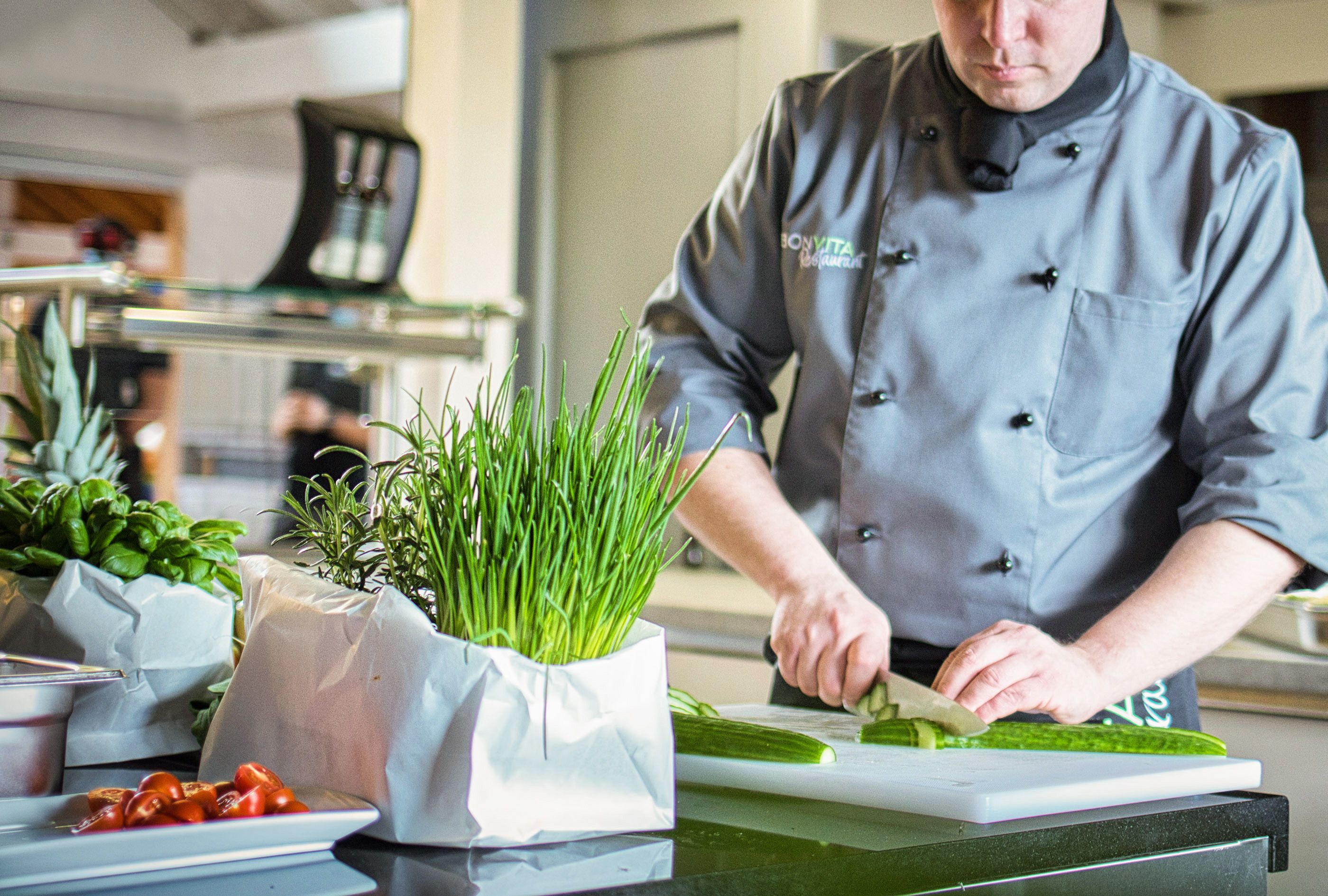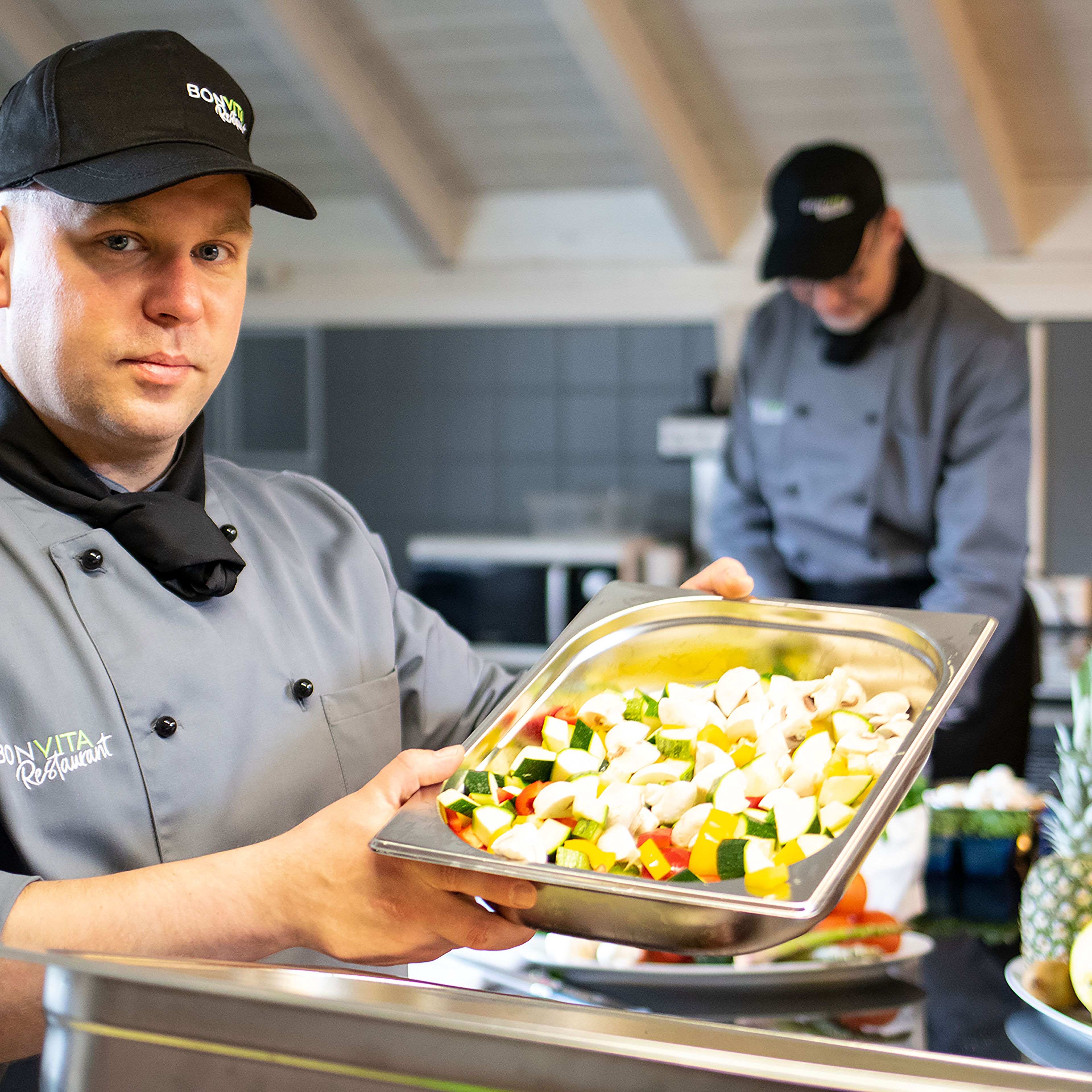 Zum Gespräch bringt Werner Echsle einen seiner Mitarbeiter mit: Mathias Leible leitet das operative Geschäft bei BONVITA und ist Teil des BONVITA-Managementteams. Die Leidenschaft der beiden ist spürbar und ansteckend: Leidenschaft für hochwertiges Essen, für ihr durchdachtes Konzept und nicht zuletzt für „ihre Leute“. Denn es sind immerhin 445 Mitarbeitende, die tagtäglich die Tischgäste verwöhnen.