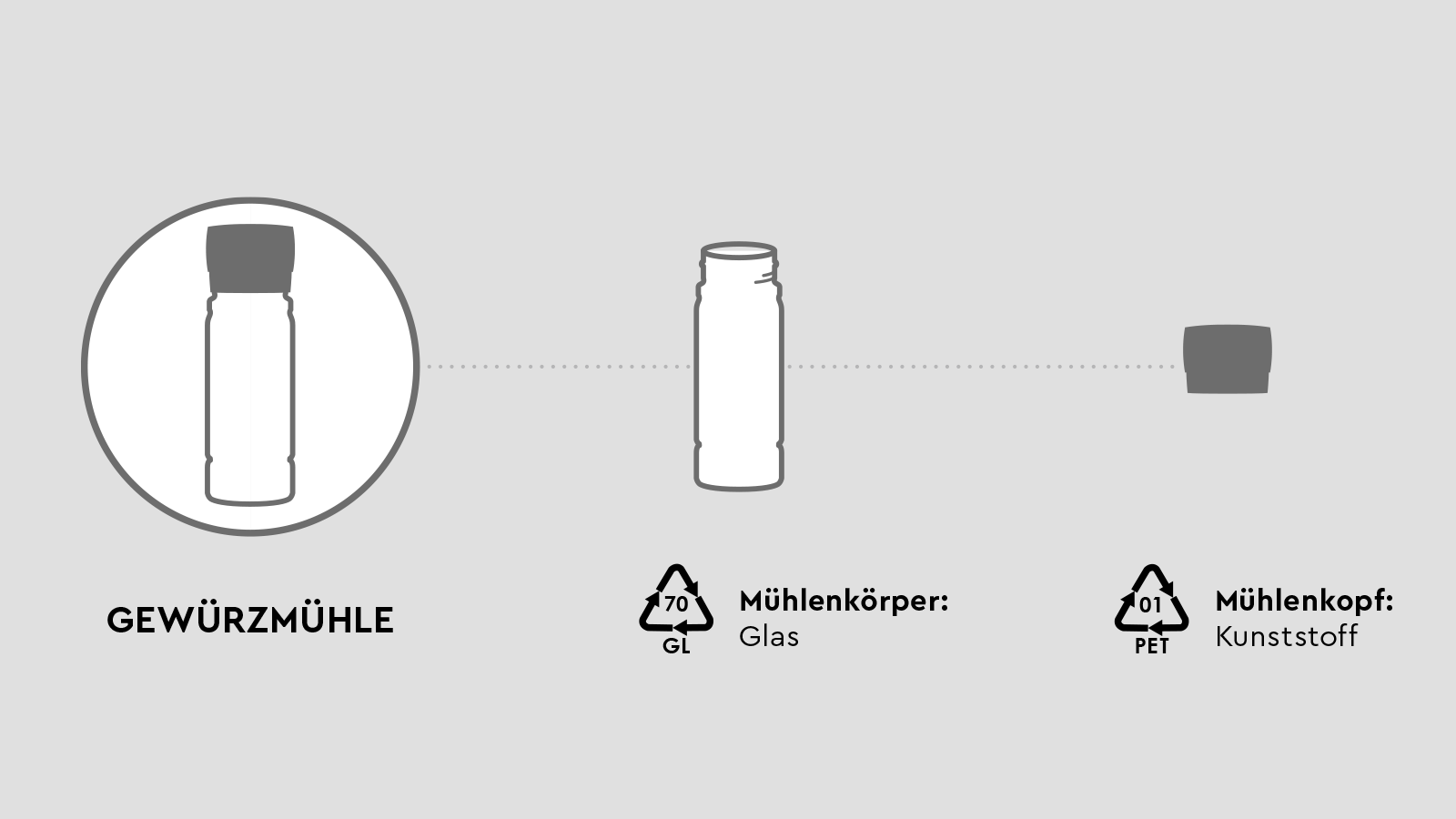 Der Mühlenkopf unserer Gewüzmühlen besteht zu 100% aus recyceltem Plastik. Das Gehäuse und das Mahlwerk sind aus Glas und hochwertiger Keramik gefertigt.
